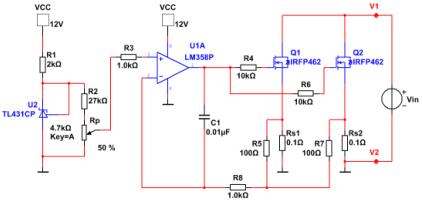 電子負載mos管是靠功率管的耗散功率(發熱)消耗電能的,流經MOS管電流過大會導致耗散功率過大,容易燒壞MOS管。為此可以采用多管并聯的方式來均分電流。由于元件具有離散性和差異性,流經每個MOS管的電流實際并不一致,可以在電路中加入均流電阻,圖中R4、R5、R6、R7為均流電阻。注意,在這種電路中,按上文式子計算出來Rs是總電阻,Id是總電流。
