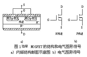 功率MOSFET的內(nèi)部結(jié)構(gòu)和電氣符號如圖1所示;其導(dǎo)通時(shí)只有一種極性的載流子(多子)參與導(dǎo)電,是單極型晶體管。導(dǎo)電機(jī)理與小功率mos管相同,但 結(jié)構(gòu)上有較大區(qū)別,小功率MOS管是橫向?qū)щ娖骷β蔒OSFET大都采用垂直導(dǎo)電結(jié)構(gòu),又稱為VMOSFET(Vertical MOSFET),大大提高了MOSFET器件的耐壓和耐電流能力。