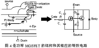 圖4是功率MOSFET的結(jié)構(gòu)和其相應(yīng)的等效電路。除了器件的幾乎每一部分存在電容以外,還必須考慮MOSFET還并聯(lián)著一個二極管。同時(shí)從某個角度 看、它還存在一個寄生晶體管。(就像IGBT也寄生著一個晶閘管一樣)。這幾個方面,是研究MOSFET動態(tài)特性很重要的因素。