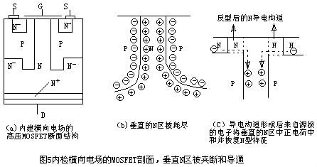 以上兩種辦法不能降低高壓MOSFET的導(dǎo)通電阻,所剩的思路就是如何將阻斷高電壓的低摻雜、高電阻率區(qū)域和導(dǎo)電通道的高摻雜、低電阻率分開解決。如除 導(dǎo)通時(shí)低摻雜的高耐壓外延層對導(dǎo)通電阻只能起增大作用外并無其他用途。這樣,是否可以將導(dǎo)電通道以高摻雜較低電阻率實(shí)現(xiàn),而在MOSFET關(guān)斷時(shí),設(shè)法使 這個通道以某種方式夾斷,使整個器件耐壓僅取決于低摻雜的N-外延層。基于這種思想,1988年INFINEON推出內(nèi)建橫向電場耐壓為600V的 COOLMOS,使這一想法得以實(shí)現(xiàn)。內(nèi)建橫向電場的高壓MOSFET的剖面結(jié)構(gòu)及高阻斷電壓低導(dǎo)通電阻的示意圖如圖5所示。
