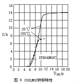 COOLMOS的最大特點(diǎn)之一就是它具有短路安全工作區(qū)(SCSOA),而常規(guī)MOS不具備這個特性。 COOLMOS的SCSOA的獲得主要是由于轉(zhuǎn)移特性的變化和管芯熱阻降低。COOLMOS的轉(zhuǎn)移特性如圖6所示。從圖6可以看到,當(dāng)VGS>8V 時(shí),COOLMOS的漏極電流不再增加,呈恒流狀態(tài)。特別是在結(jié)溫升高時(shí),恒流值下降,在最高結(jié)溫時(shí),約為ID25℃的2倍,即正常工作電流的3-3.5 倍。在短路狀態(tài)下,漏極電流不會因柵極的15V驅(qū)動電壓而上升到不可容忍的十幾倍的ID25℃,使COOLMOS在短路時(shí)所耗散的功率限制在 350V×2ID25℃,盡可能地減少短路時(shí)管芯發(fā)熱。管芯熱阻降低可使管芯產(chǎn)生的熱量迅速地散發(fā)到管殼,抑制了管芯溫度的上升速度。因 此,COOLMOS可在正常柵極電壓驅(qū)動,在0.6VDSS電源電壓下承受10ΜS短路沖擊,時(shí)間間隔大于1S,1000次不損壞,使COOLMOS可像 IGBT一樣,在短路時(shí)得到有效的保護(hù)。