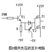 功率MOSFET屬于電壓型控制器件,只要柵極和源極之間施加的電壓超過其閥值電壓就會導(dǎo)通。由于MOSFET存在結(jié)電容,關(guān)斷時(shí)其漏源兩端電壓的突然 上升將會通過結(jié)電容在柵源兩端產(chǎn)生干擾電壓。常用的互補(bǔ)驅(qū)動電路的關(guān)斷回路阻抗小,關(guān)斷速度較快,但它不能提供負(fù)壓,故抗干擾性較差。為了提高電路的抗干 擾性,可在此種驅(qū)動電路的基礎(chǔ)上增加一級有V1、V2、R組成的電路,產(chǎn)生一個負(fù)壓,電路原理圖如圖8所示。