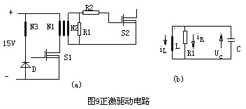 電路原理如圖9(a)所示,N3為去磁繞組,S2為所驅(qū)動的功率管。R2為防止功率管柵極、源極端電壓振蕩的一個阻尼電阻。因不要求漏感較小,且從速度方面考慮,一般R2較小,故在分析中忽略不計(jì)。