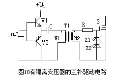 如圖10所示,V1、V2為互補(bǔ)工作,電容C起隔離直流的作用,T1為高頻、高磁率的磁環(huán)或磁罐。