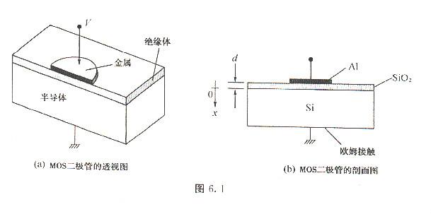 MOS二極管的透視結構如圖6.1(a)所示,圖6.1(b)為其剖面結構,其中d為氧化層的厚度,而V為施加于金屬平板上的電壓.在本節(jié)中,當金屬平板相對于歐姆接觸為正偏樂時,V為正值;而當金屬平板相對于歐姆接觸為負偏壓時,V為負值。