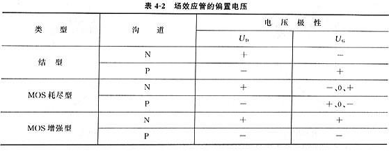 結型場效應管的柵極應加反向偏置電壓,即N溝道管加負柵壓,mos管P溝道管加正柵壓。增強型絕緣柵場效應管應加正向柵壓。耗盡型絕緣柵場效應管的柵壓可正、可負、可為“o”,見表4-2。加偏置的方法有固定偏置法、自給偏置法、直接耦合法等。