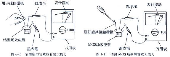 將萬用表置于“RX100”擋,兩表筆分別接漏極D和源極s,然后用F捏住柵極G(注入人體感應電壓),表針應向左或向右擺動,如圖4-40所示。表針擺動幅度越大闡明場效應管的放大才能越大。假如表針不動,闡明該管已壞。