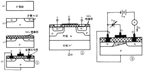 圖1是典型平面N溝道增強型MOSFET的剖面圖。它用一塊P型硅半導體材料作襯底(圖la),在其面上擴散了兩個N型區(圖lb),再在上面覆蓋一層二氧化硅(SiQ2)絕緣層(圖lc),最后在N區上方用腐蝕的方法做成兩個孔,用金屬化的方法分別在絕緣層上及兩個孔內做成三個電極:G(柵極)、S(源極)及D(漏極),如圖1d所示。