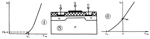 由于這種結構在VGS=0時,ID=0,稱這種MOSFET為增強型。另一類MOSFET,在VGS=0時也有一定的ID(稱為IDSS),這種MOSFET稱為耗盡型。它的結構如圖5所示,它的轉移特性如圖6所示。VP為夾斷電壓(ID=0)。