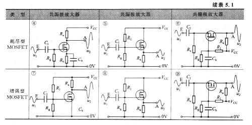從表中也不難看出,不同組態的電路,偏置電路也有所不同。表5.1中的①為自偏壓,相似的還有④,自偏壓不適用于增強型器材,由于這類器材的敞開電壓不是從0開端的;②為分膚偏壓,也稱為混合偏壓,是最常用的一種,除了①、④之外均為分壓偏壓方法。