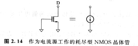耗盡型晶體管對(duì)于模擬電路設(shè)計(jì)來說是一種很方便的器件。例如,使用耗盡型晶體管的1V以下的電源電壓下工作的rail to rail工作的OP放大器。另外,如圖2. 14所示,柵極和源極接地的耗盡型NMOS晶體管可以作為電流源使用。由于VGS=o,所以漏極電流可以表示為