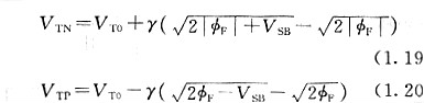 式中,VTO是VSB=0時(shí)(即不發(fā)牛襯底偏置效應(yīng)時(shí))的閾值電壓。它的極性在NMOS中是VTO>0,關(guān)于PMOS是VTO