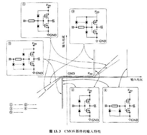 圖13.4示出CMOS器件的輸出等效電路。輸出電壓在GND~VDD之間表現出通常的MOS晶體管的輸出特性。這種狀態下,具有由輸出電流一輸出電壓計算出的輸出阻抗特性(規范邏輯中是幾十Ω)。