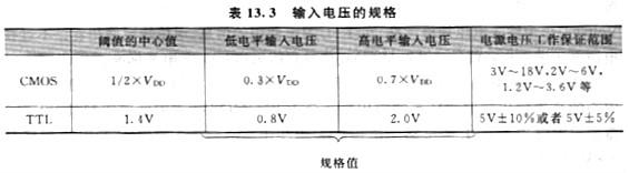 表13.3列出邏輯器件最典型的輸入電壓的規格。電源電壓為5V的電子設備中,要按CMOS電平或者TTL電平停止設計。為什么存在兩種規格?這是由于CMOS與雙極的電路構造不同。世界上首先降生的邏輯器件是TTL。TTL長期作為邏輯電路的主流被運用著。后來的CMOS在開展過程中逐步樹立起CMOS本人的規格設定,這是歷史緣由構成的。