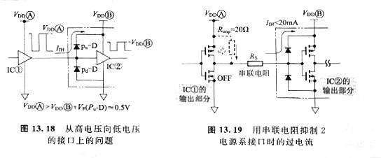 在接納IC的電源電壓比發送lC的電源電壓低的場所,如圖13.18所示,經過IC②的輸入維護電路產牛的穩定電流IIH會導致器件劣化,所以不能夠直接中止接口。針對這個問題,如圖13. 19所示,采用給信號線插入串聯電阻,抑止電流IIH的方法。