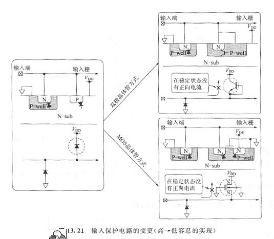 如圖13. 21所示,用晶體管的擊穿特性交流二極管的正向特性,去掉從輸入到VDD線的電流途徑。作為維護電路,也能夠吸收比VDD線的電壓電平更高的正的外來浪涌。當然,這個擊穿電壓應該設計得比IC內部的初級輸入柵耐壓低。
