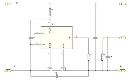 保護板有兩個核心部件:一塊保護IC,它是由精確的比較器來獲得可靠的保護參數;另外是MOSFET串在主充放電回路中擔當高速開關,執行保護動作。電路原理圖如下: