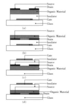 圖1(c),(d)為頂柵結構,即首先在襯底上制作有機半導體層,然后制作源、漏電極,隨后再制作絕緣層,最后在絕緣層上面制作柵極。這兩種柵極位于最頂部的頂柵結構在文獻報道中并不是很多。