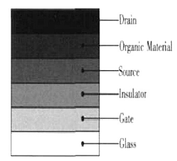 圖2是垂直溝道OFET結構,是以縮短溝道長度為目的的一類新型場效應晶體管。它以半導體層為溝道長度,依次蒸鍍漏-源-珊電極,通過改變柵電壓來控制源、漏電極的電流變化。