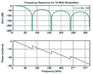 改善隔離系統(tǒng)線性度的一種常見方法是將ADC移至隔離柵的另一側(cè)并隔離數(shù)字信號。在許多情況下,這需要將串聯(lián)ADC與數(shù)字信號隔離器結(jié)合使用。由于對電機電流反饋存在高頻的特殊要求,以及需要對驅(qū)動保護進行快速響應,因此可選擇Σ-Δ型ADC。Σ-Δ型ADC配有一個可將模擬信號轉(zhuǎn)換為一位碼流的線性調(diào)制器,其后配備可將信號重構(gòu)為高分辨率數(shù)字字的數(shù)字濾波器。此方法的好處是可使用兩種不同的數(shù)字濾波器:較慢的用于高保真反饋,另一個低保真快速濾波器用于保護逆變器。在圖2中,繞組分流器用于測量電機繞組電流,隔離式ADC用于在隔離柵上傳輸10 MHz數(shù)據(jù)流。Sinc濾波器可將高分辨率電流數(shù)據(jù)提交給電機控制算法,該算法會計算施加所需逆變器電壓需要的逆變器占空比。另一個低分辨率濾波器可檢測電流過載,并在出現(xiàn)故障時將跳變信號發(fā)送至PWM調(diào)制器。Sinc濾波器頻率響應曲線解釋說明了合適的參數(shù)選擇如何能夠使濾波器抑制電流采樣中的PWM開關紋波。