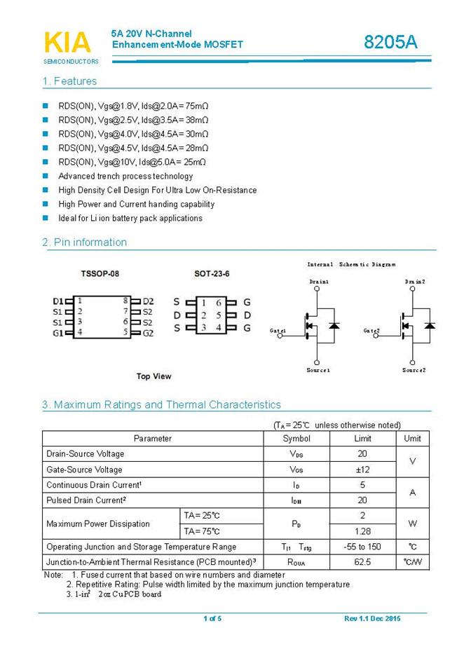 參數: ID(A): 5 BVDSS(V): 20 RDS(ON): 0.075 Qg(nC): 8.11 Package: TSSOP-08、SOT-23-6