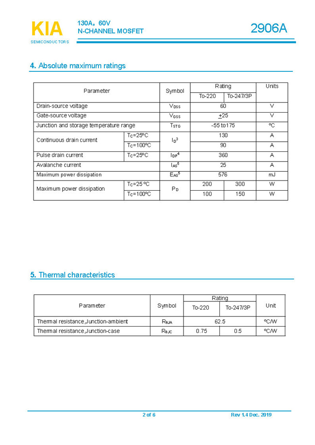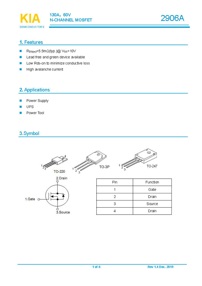 參數: ID(A): 130 BVDSS(V): 60 RDS(ON): 5.5mΩ Qg(nC): 66.34 Package: TO-220.TO-3P.TO-247