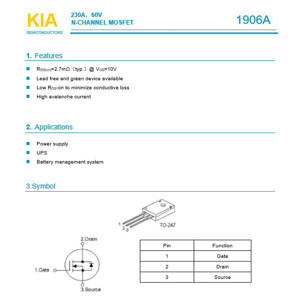 參數: ID(A): 230    BVDSS(V): 60    RDS(ON): 0.0027    Qg(nC): 172    Package: TO-247