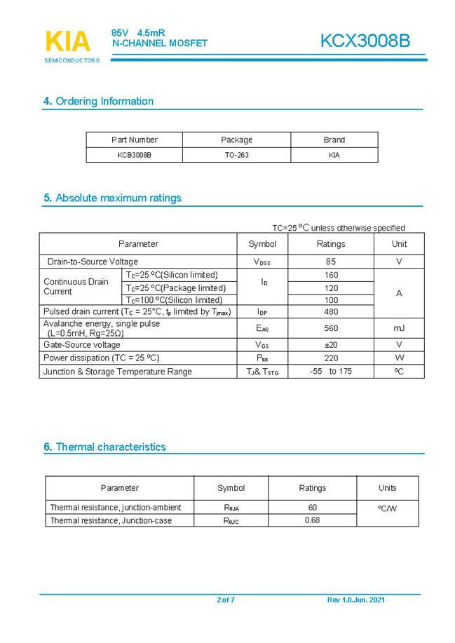 參數: ID(A): 160 BVDSS(V): 85 RDS(ON): 4.5mΩ Qg(nC): 80 Package: TO-263