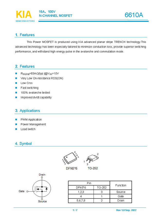 參數(shù): ID(A): 15 BVDSS(V): 100 RDS(ON): 83mΩ Qg(nC): 19.2 Package: TO-252.DFN5*6
