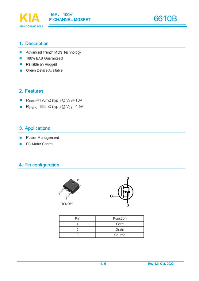 參數: ID(A): -15    BVDSS(V): -100    RDS(ON): 170mΩ    Qg(nC): 19    Package: TO-252