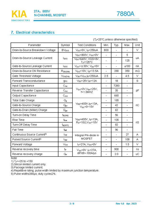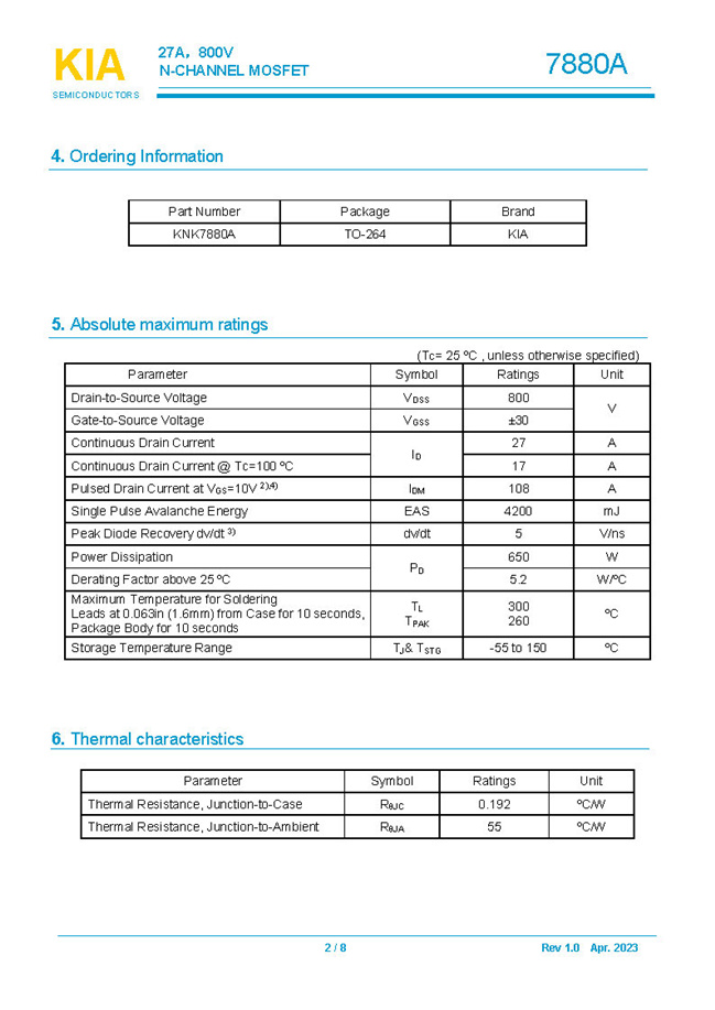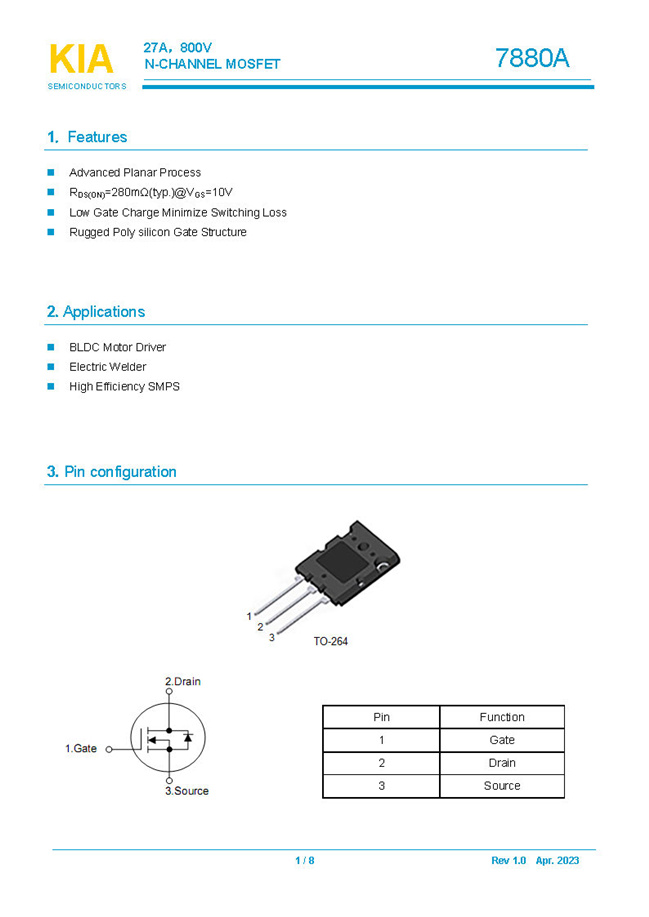 參數: ID(A): 27 BVDSS(V): 800 RDS(ON): 280mΩ Qg(nC): 185 Package: TO-264