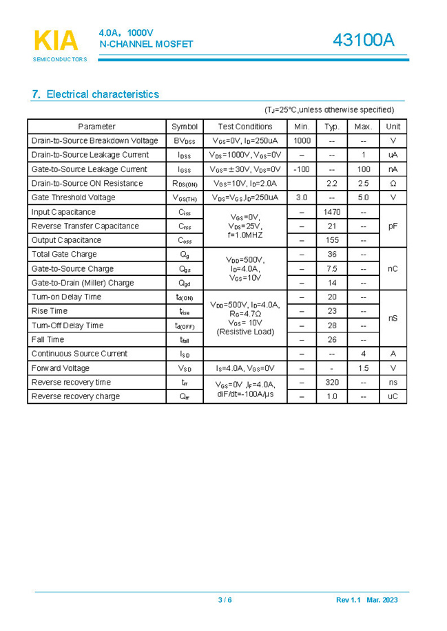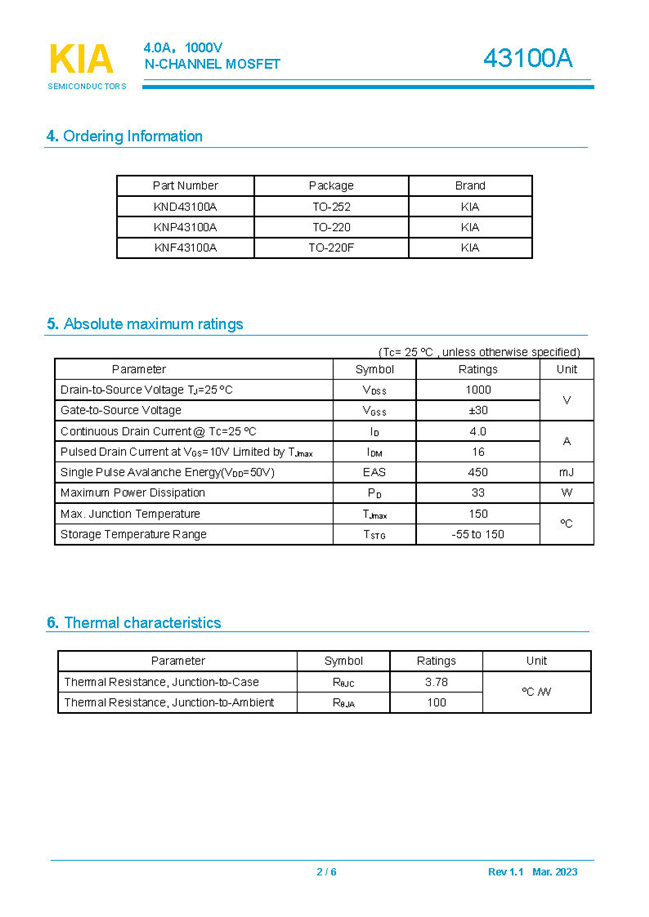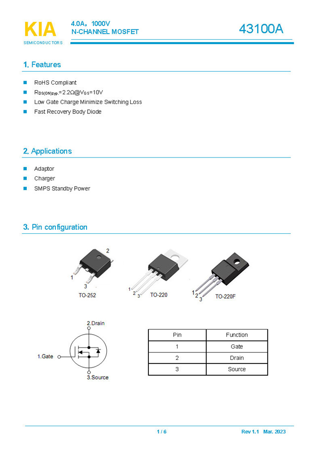 參數: ID(A): 4    BVDSS(V): 1000    RDS(ON): 2.2Ω    Qg(nC): 36    Package: TO-252.TO-220.TO-220F