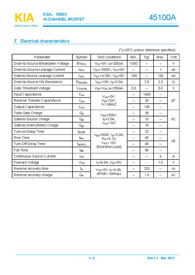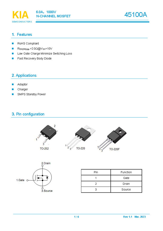 參數(shù): ID(A): 6 BVDSS(V): 1000 RDS(ON): 2Ω Qg(nC): 35 Package: TO-252.TO-220.TO-220F