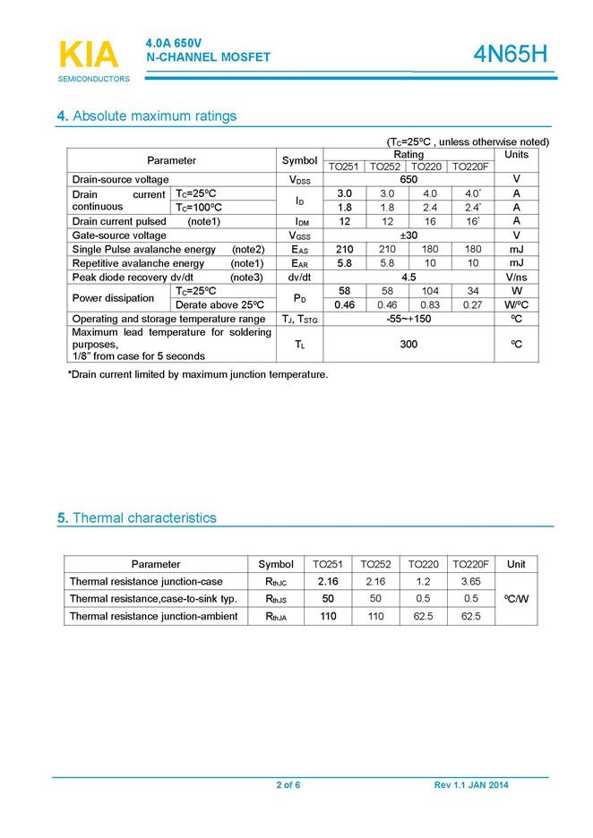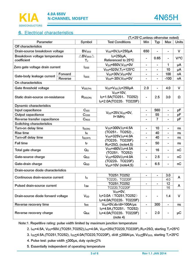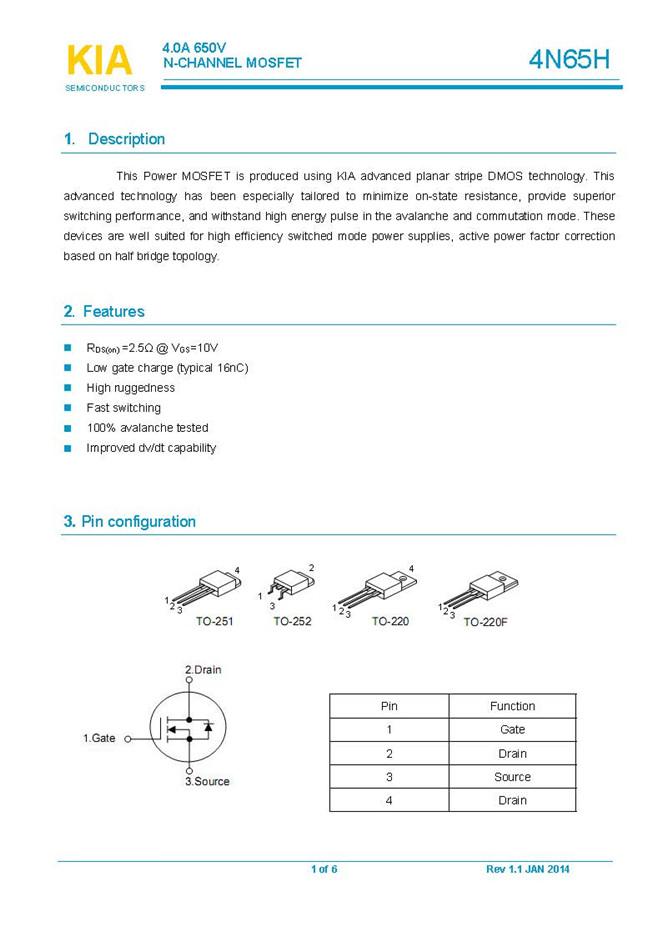 參數: ID(A): 4    BVDSS(V): 650    RDS(ON): 3    Qg(nC): 16    Package: TO-251、TO-252、TO-220、TO-220F
